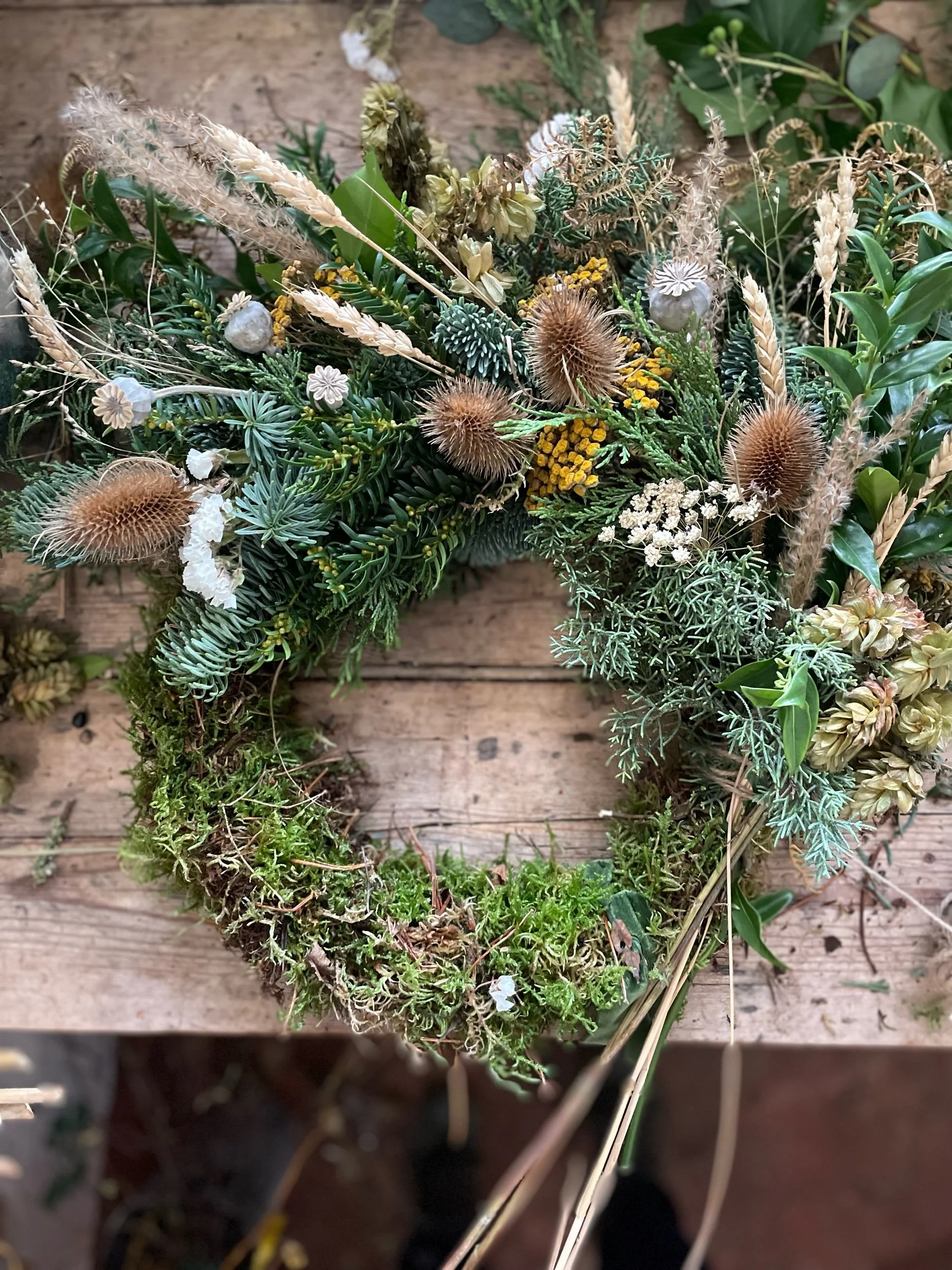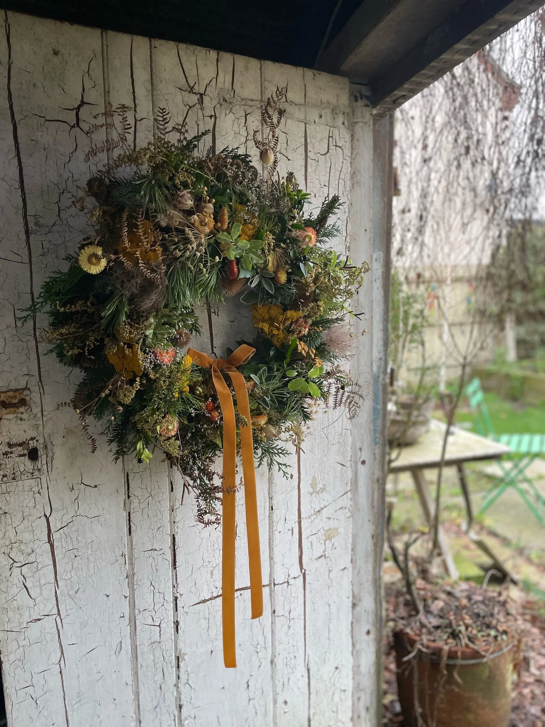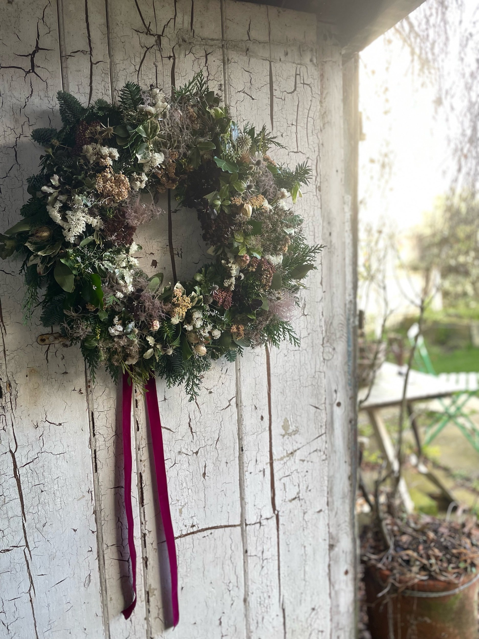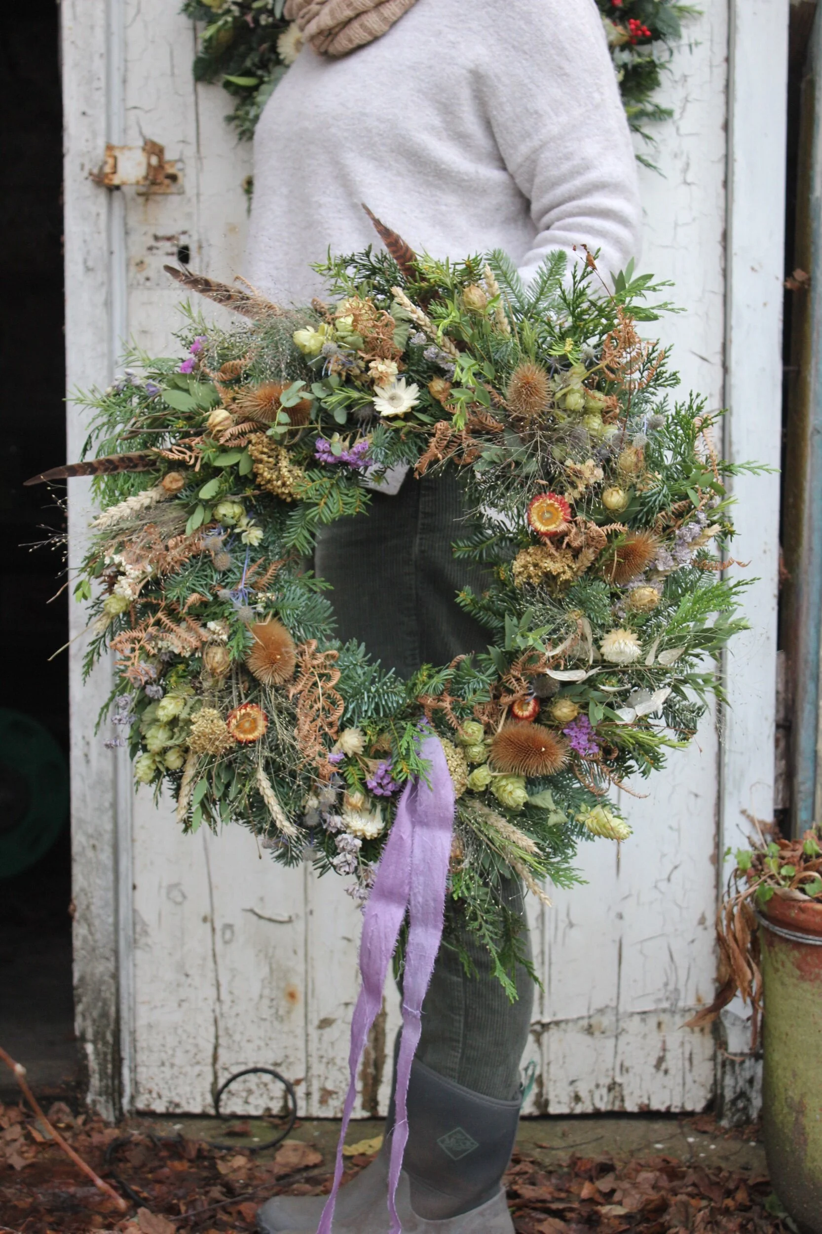 The ultimate in Hand-crafted, British-grown seasonal loveliness - a vibrant mix of differing evergreen hues and adorned with Suffolk grown dried flowers, berries, foraged treasures, finished with a velvet ribbon and all created by me (Victoria!)