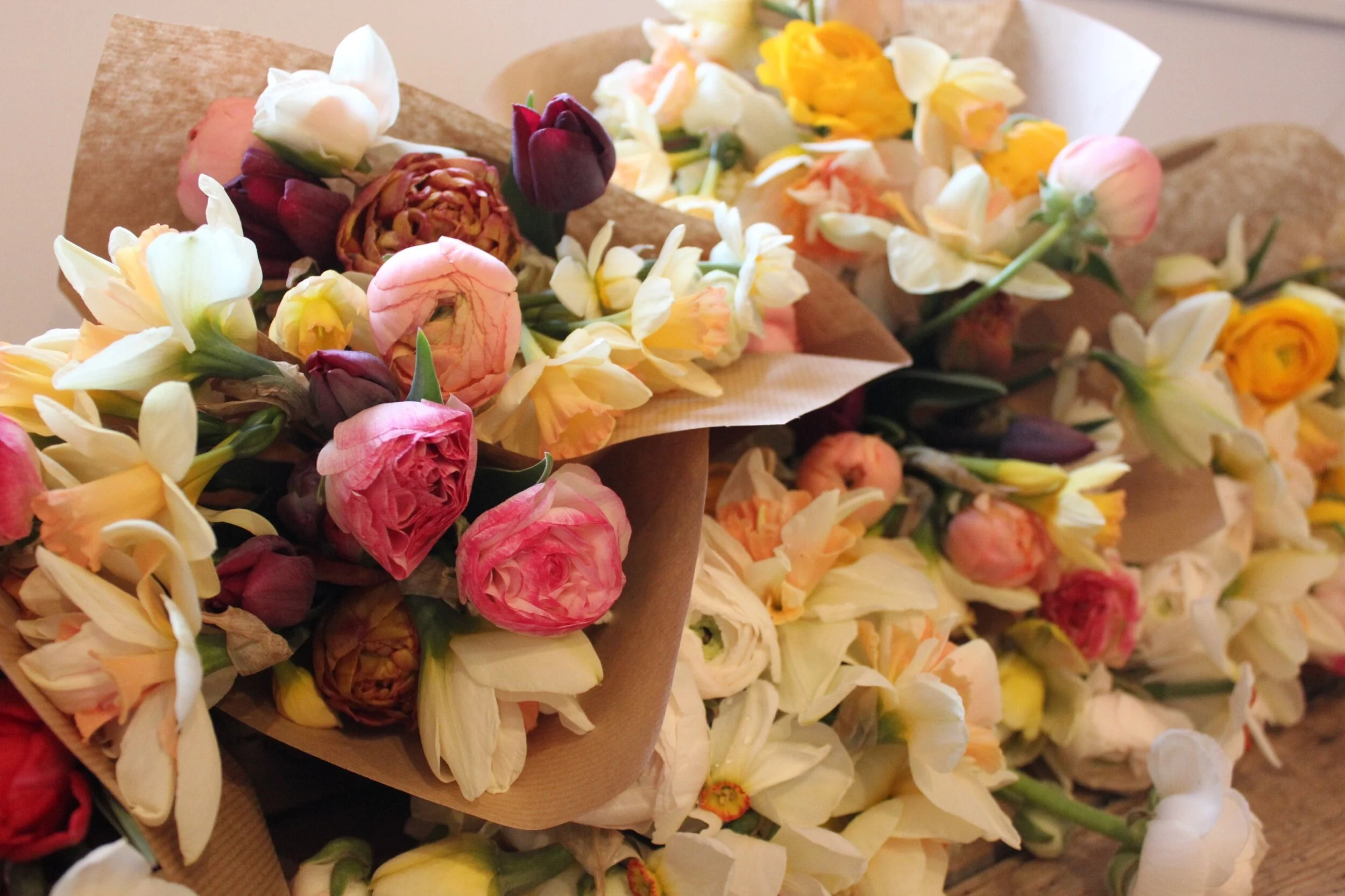 Your flowers will arrive beautifully arranged in a hand-tied bouquet, and wrapped in brown paper with a raffia bow - no plastic waste and all entirely compostable.