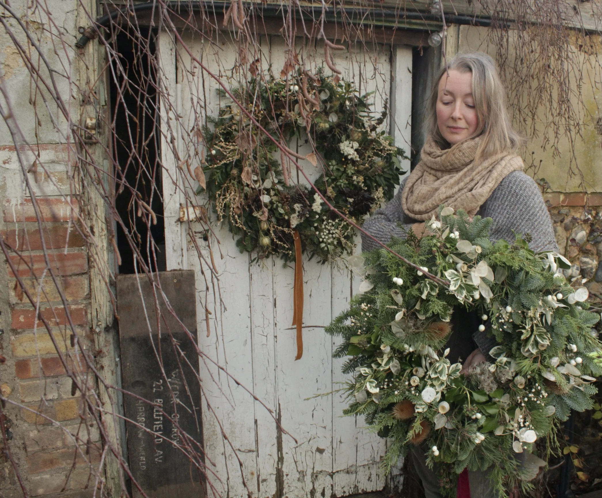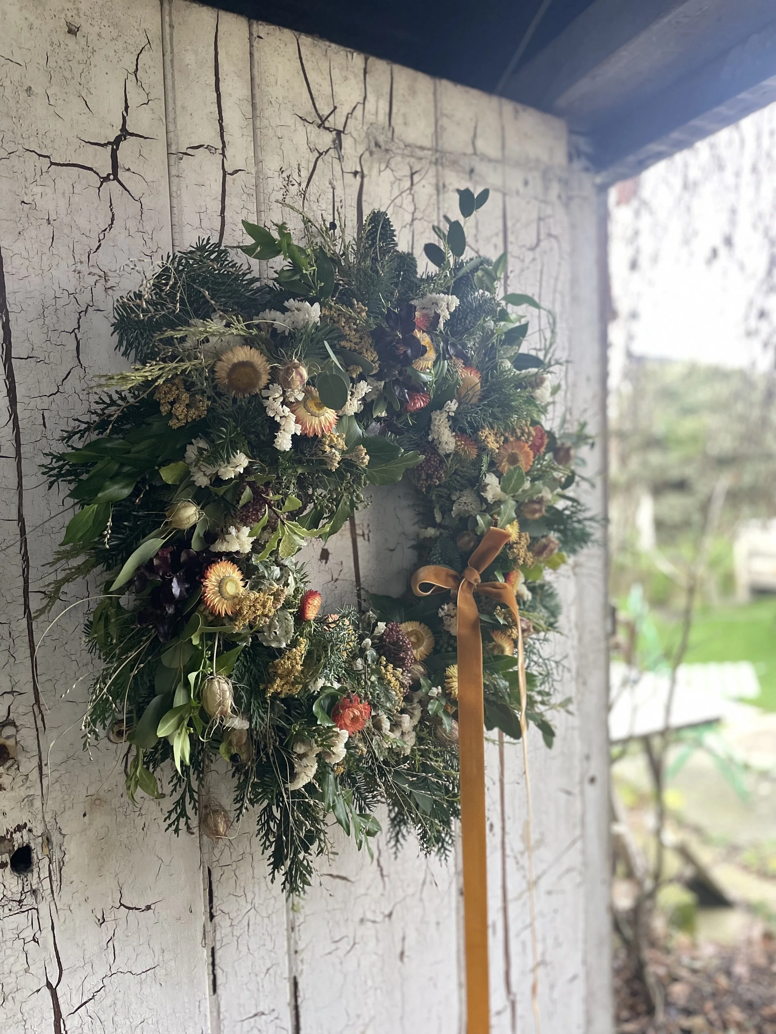 The ultimate in Hand-crafted, British-grown seasonal loveliness - a vibrant mix of differing evergreen hues and adorned with Suffolk grown dried flowers, berries, foraged treasures, finished with a velvet ribbon and all created by me (Victoria!)